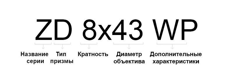 Тип призмы указан в двух вариантах: D - Roof, P - Porro. Основные характеристики: WP - водонепроницаемость, ED - использование стекла со сверхнизкой дисперсией, ZOOM - переменная кратность
