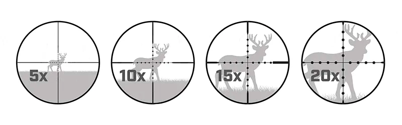 Для охоты подходят простые крестообразные прицельные сетки, без дополнительных пометок. Это позволяет быстро и легко прицеливаться на малых и средних дистанциях. К ним относятся такие сетки, как перекрестие, сетка с центральной точкой, дуплекс, German #4, пенек и другие.